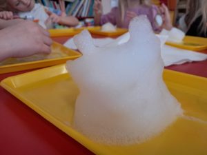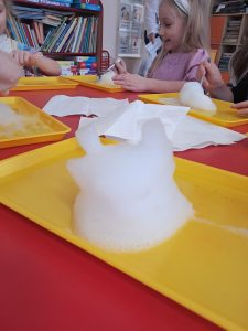 W naszym przedszkolu odbył się Wielki Dzień Twórczości z Piany! Towarzyszyła nam Lisica Rudka, dzięki której przedszkolaki nauczyły się, co jest nam potrzebne do kąpieli i jak się dokładnie umyć. Nie zabrakło też twórczych atrakcji: dzieci własnoręcznie tworzyły dekorację do sali i robiły stworki z piany i grały w kalambury. Były też wspólne tańce, śpiewy i dużo radości!