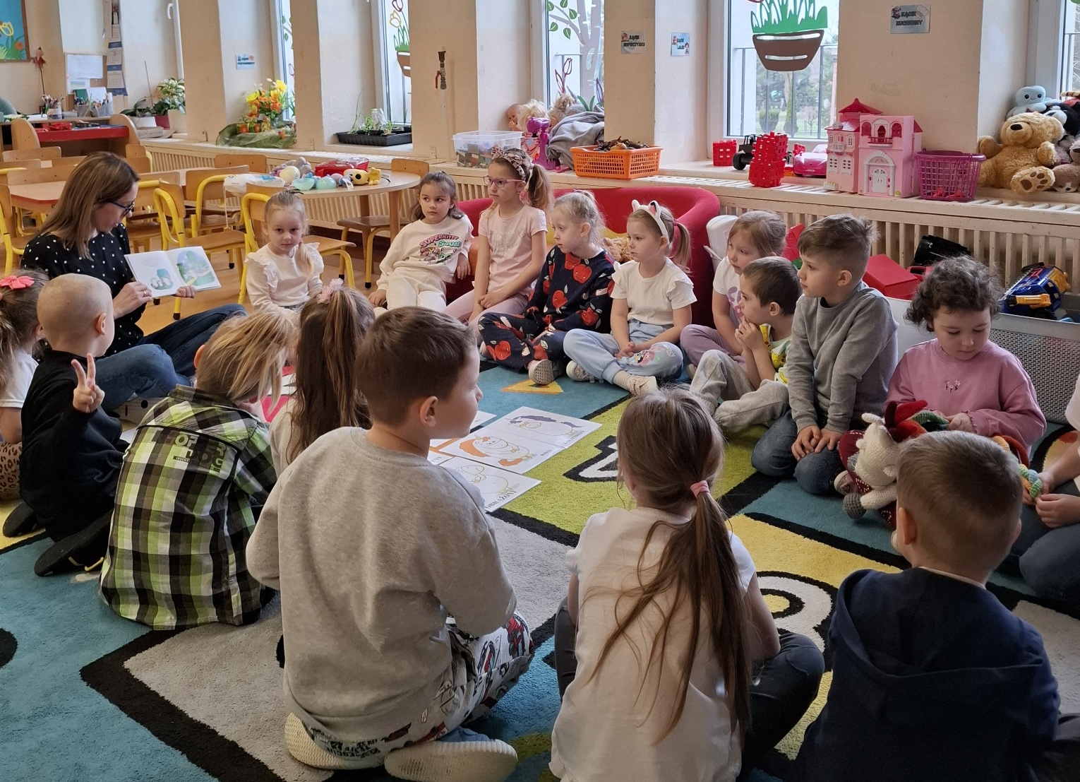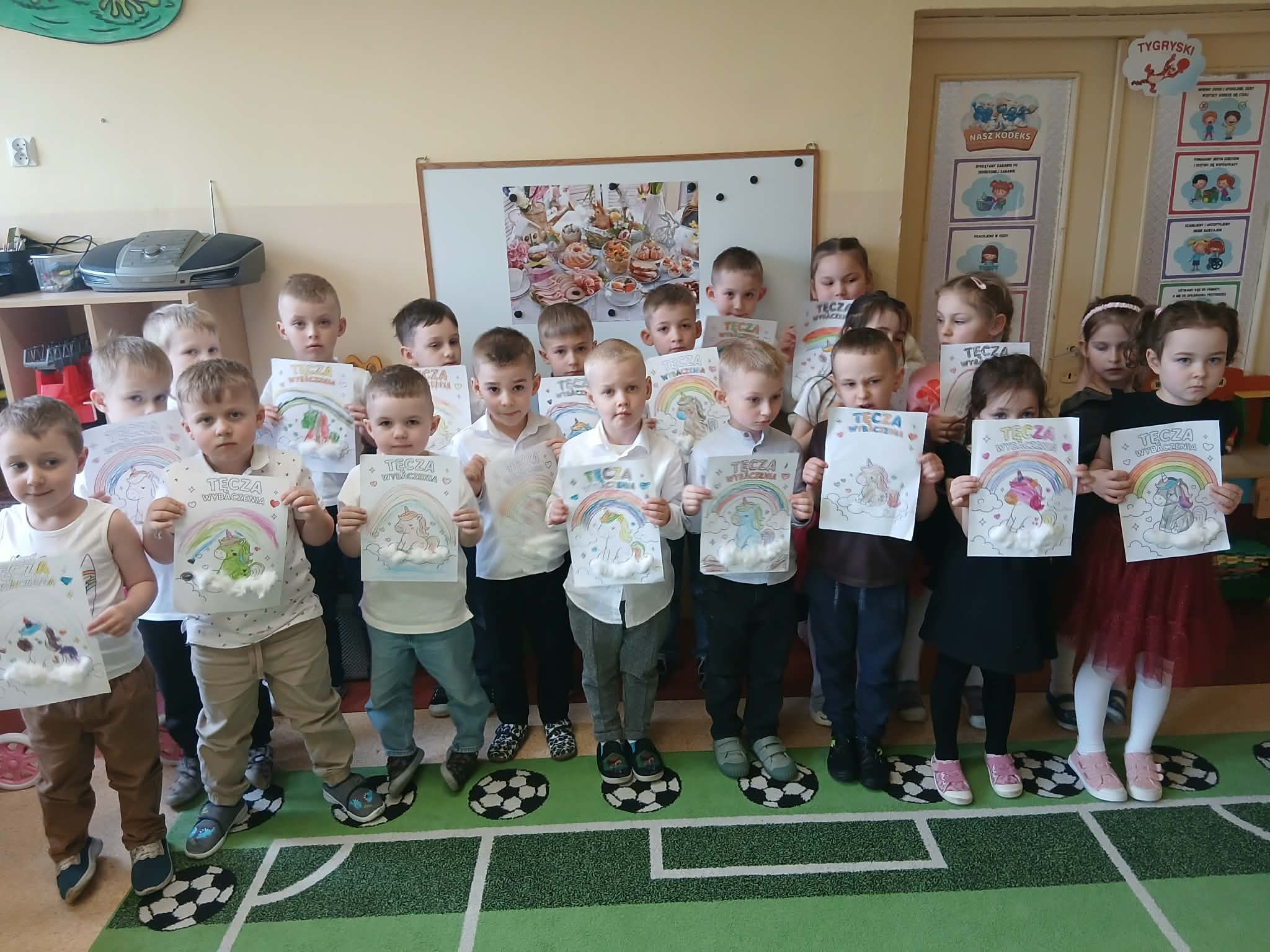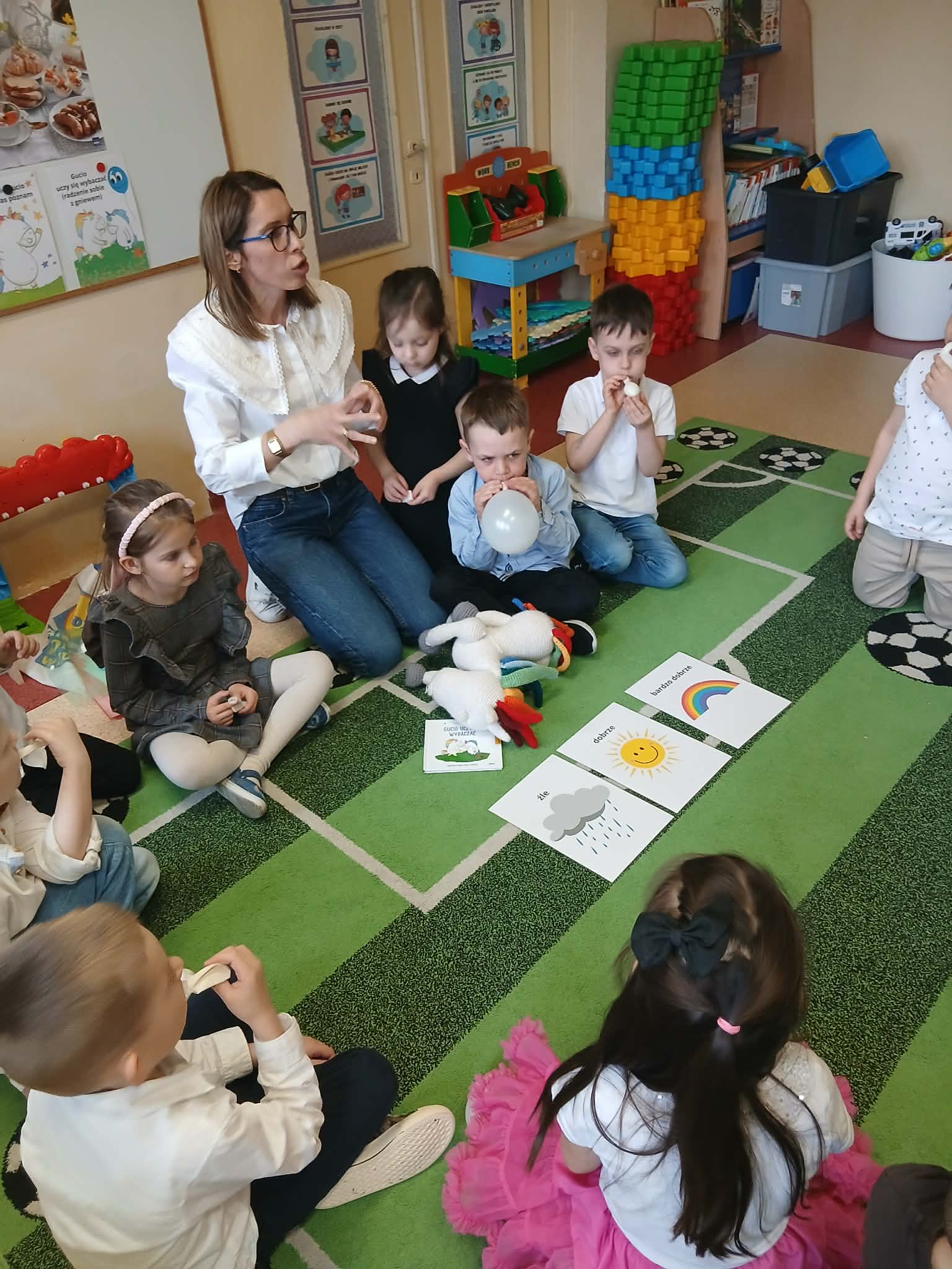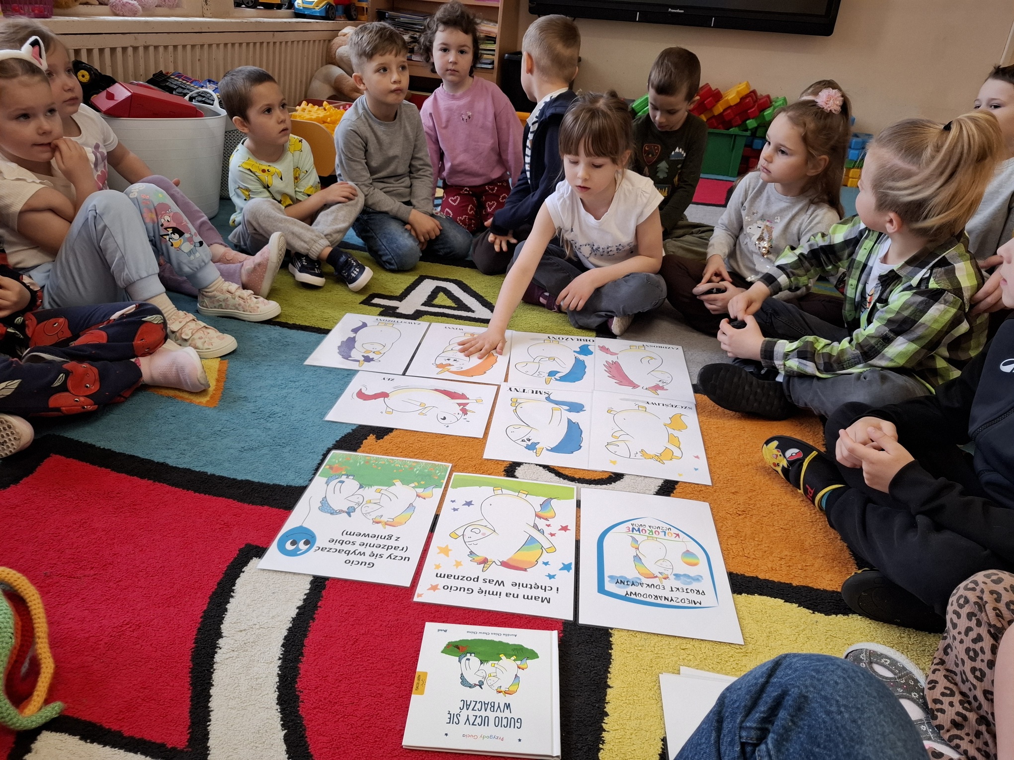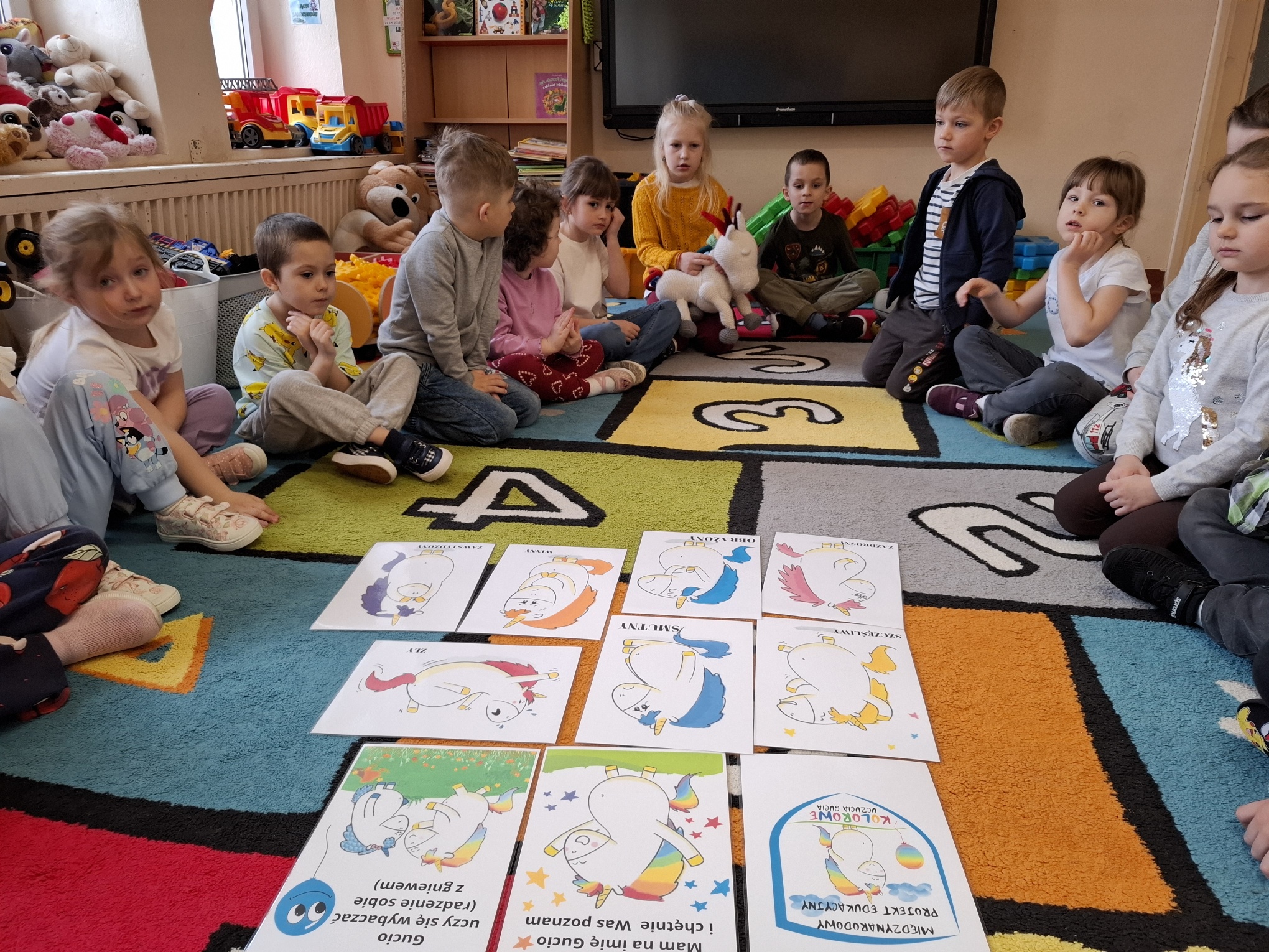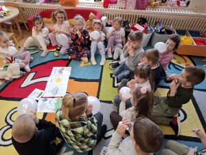 W ramach Międzynarodowego Projektu Edukacyjnego „Kolorowe Uczucia Gucia” odbyły się zajęcia inspirowane książką „Gucio uczy się wybaczać”, których celem było poznanie trudnych emocji oraz nauka wybaczania. Podczas spotkania z psychologiem Smerfy i Mądre Sowy wysłuchały historii sympatycznego jednorożca Gucia, który – podobnie jak one – doświadcza radości, smutku i złości. Uczestniczyły także w zabawach ruchowych oraz scenkach dramowych, ucząc się, jak reagować w trudnych sytuacjach i jak mówić „wybaczam”. Dużym zainteresowaniem cieszyła się praca plastyczna „Tęcza wybaczenia”, będąca symbolem radości po trudnych chwilach. Była to okazja do twórczego wyrażenia emocji. Zajęcia przebiegły w atmosferze życzliwości i wzajemnego zrozumienia, a dzieci chętnie dzieliły się swoimi doświadczeniami. To wartościowe spotkanie pomogło im zrobić kolejny krok w rozwoju emocjonalnym.