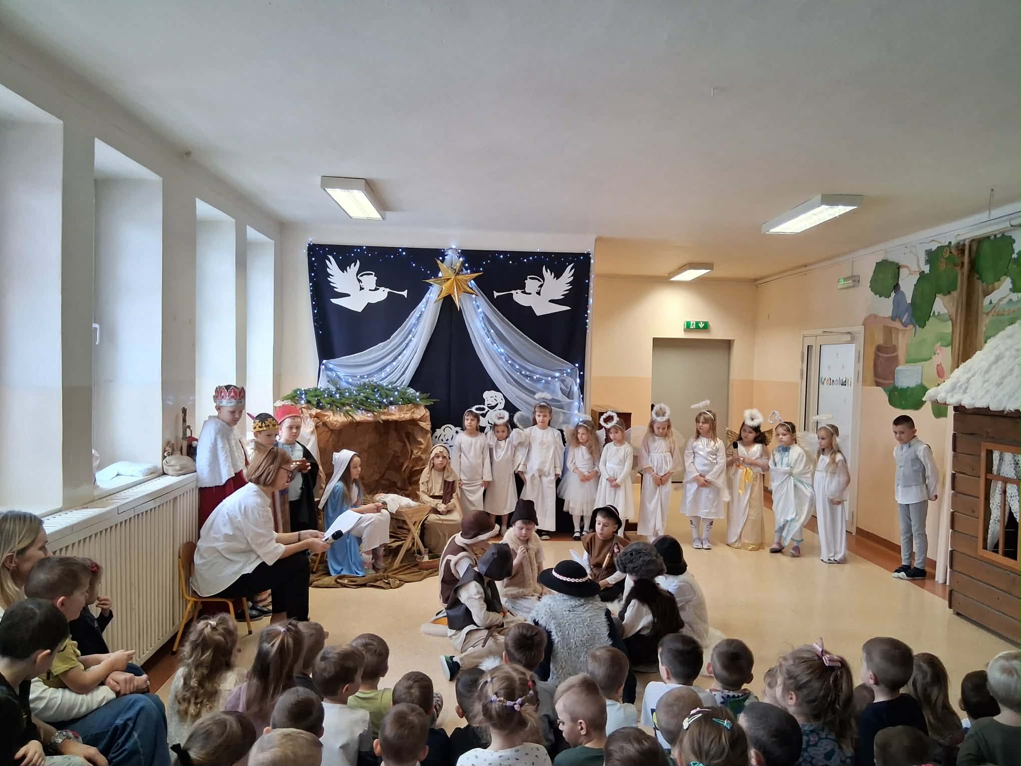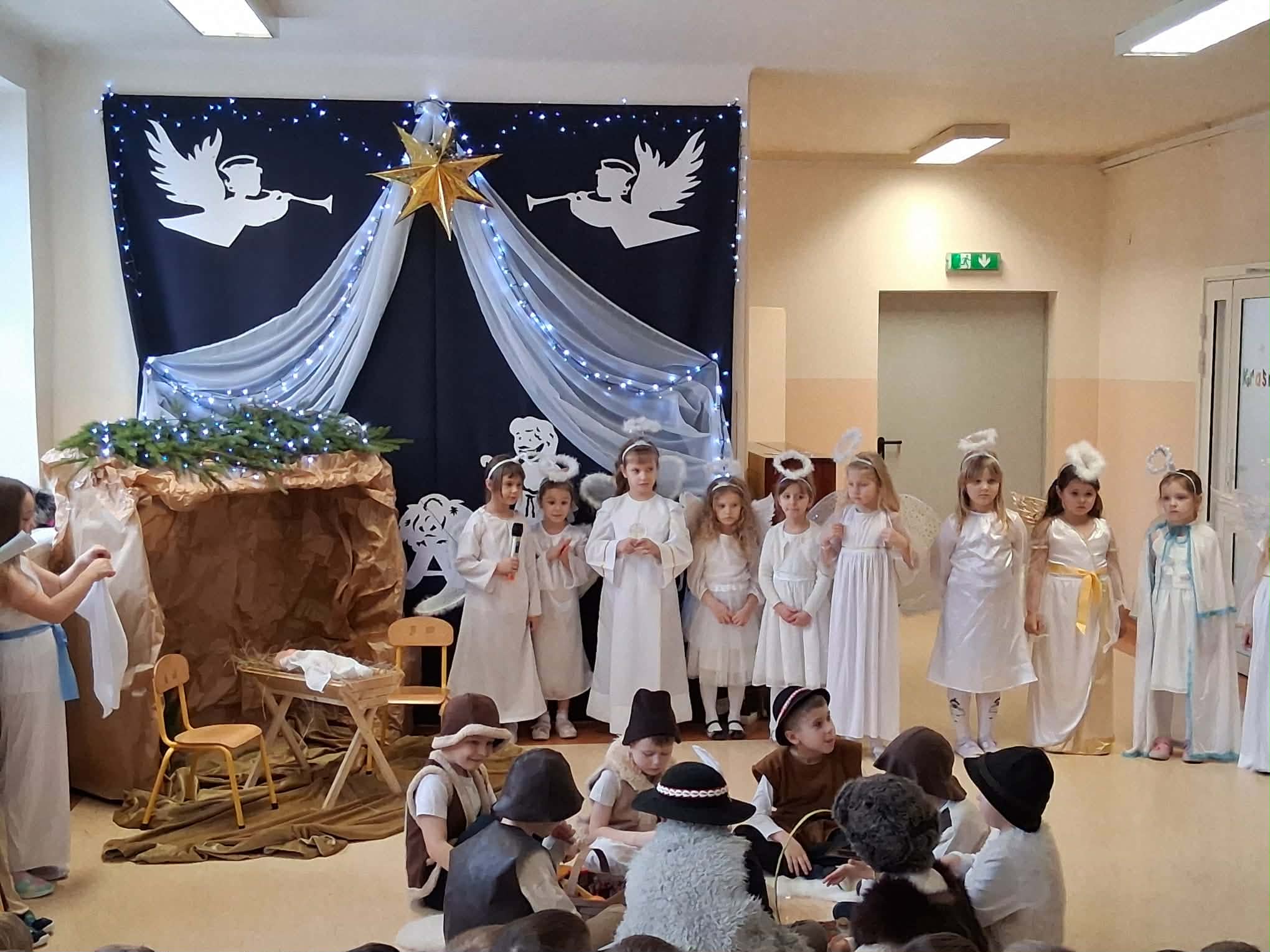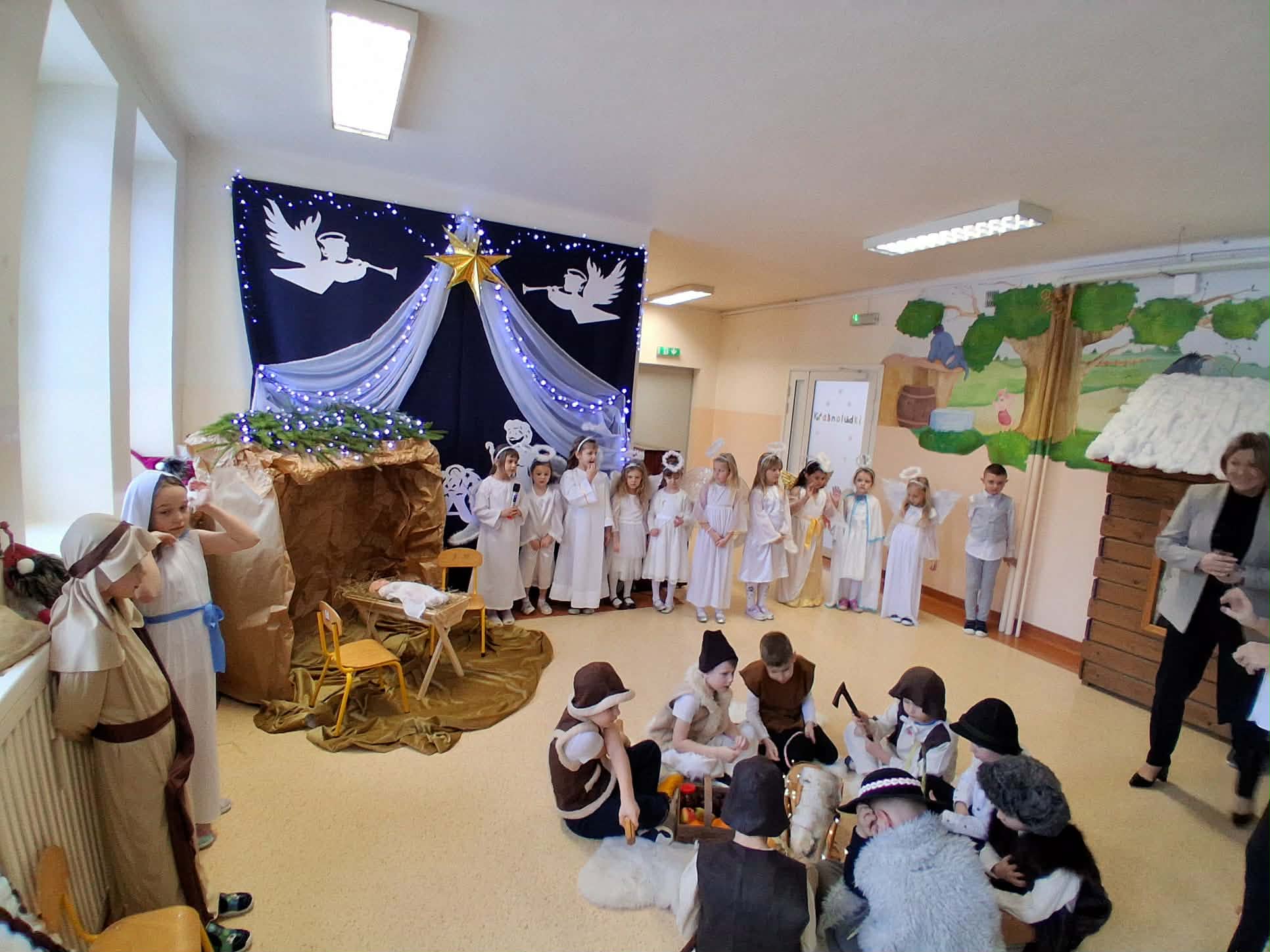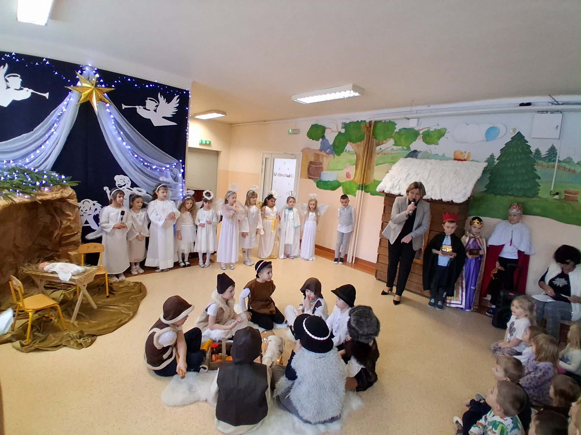 Grupa IV przygotowała Jasełka dla całej przedszkolnej społeczności oraz rodziców. Najmłodsi artyści z wielkim zaangażowaniem i radością przedstawili historię narodzin Jezusa. Występując w starannie przygotowanych strojach wcielili się w postacie Maryi, Józefa, aniołów, pasterzy oraz Trzech Króli. Całość uświetniły znane kolędy i pastorałki. Licznie zgromadzeni goście z dumą i wzruszeniem oglądali występy swoich dzieci, kolegów, nagradzając dzieci gromkimi brawami.