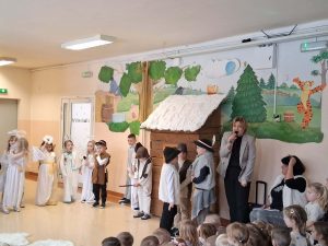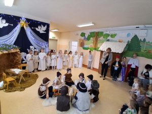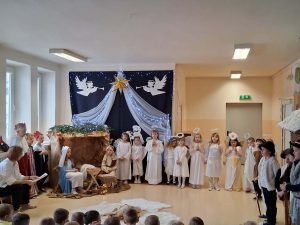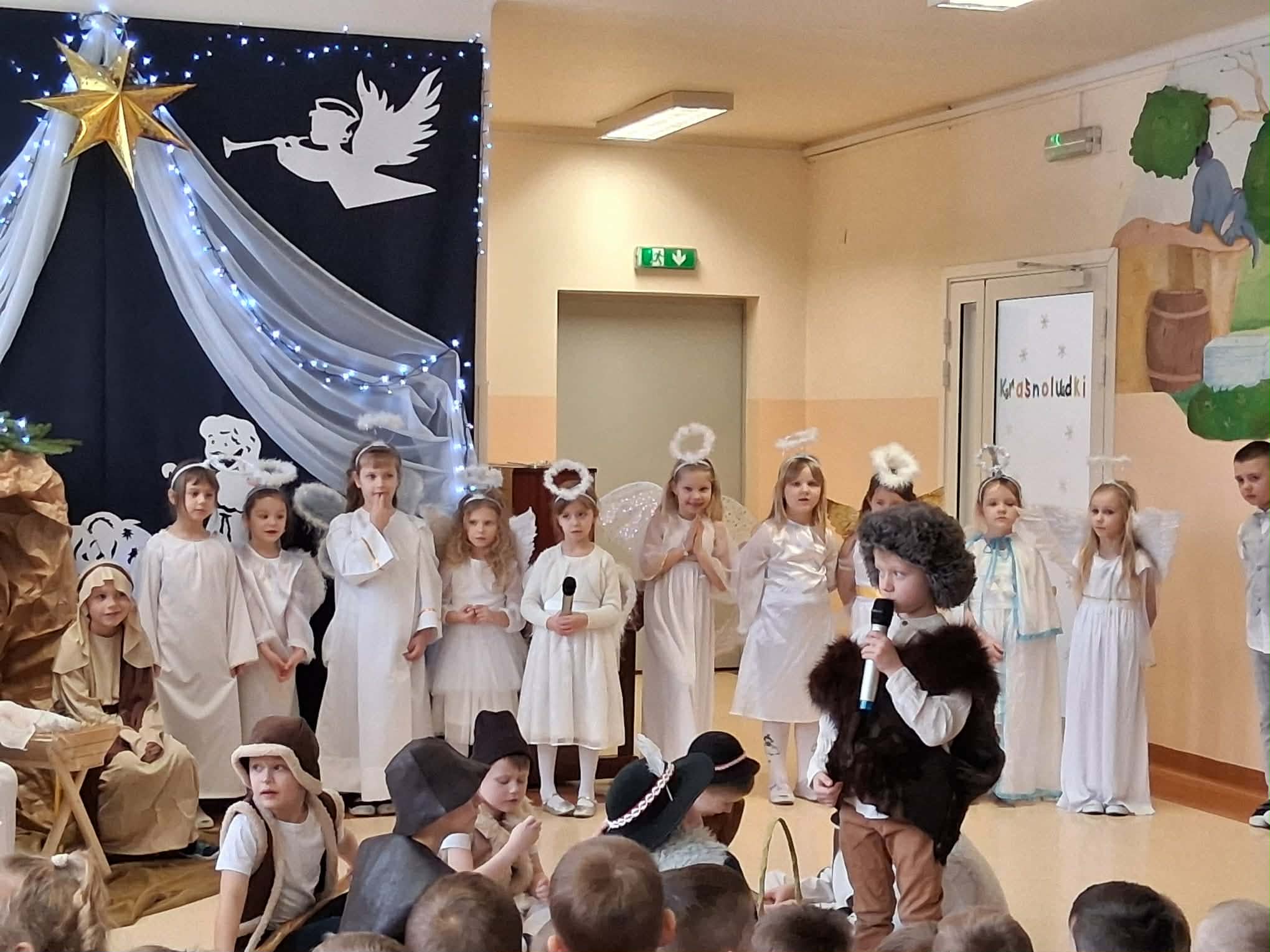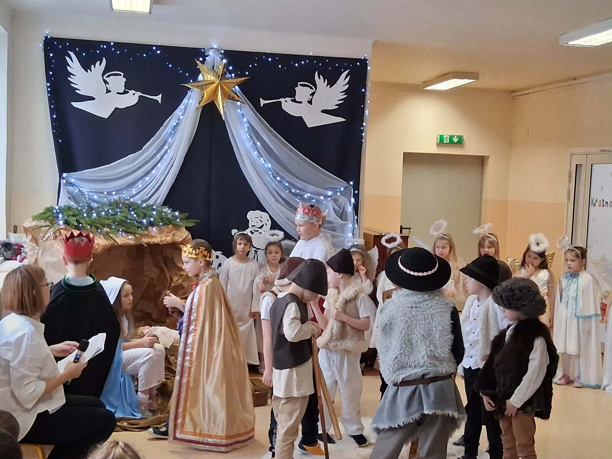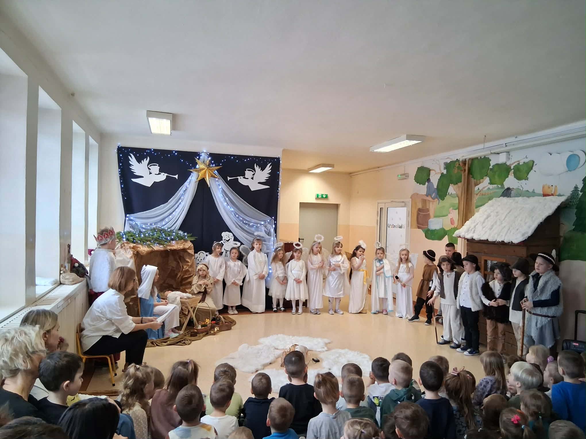 Grupa IV przygotowała Jasełka dla całej przedszkolnej społeczności oraz rodziców. Najmłodsi artyści z wielkim zaangażowaniem i radością przedstawili historię narodzin Jezusa. Występując w starannie przygotowanych strojach wcielili się w postacie Maryi, Józefa, aniołów, pasterzy oraz Trzech Króli. Całość uświetniły znane kolędy i pastorałki. Licznie zgromadzeni goście z dumą i wzruszeniem oglądali występy swoich dzieci, kolegów, nagradzając dzieci gromkimi brawami.
