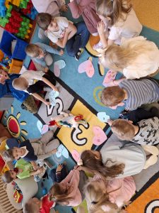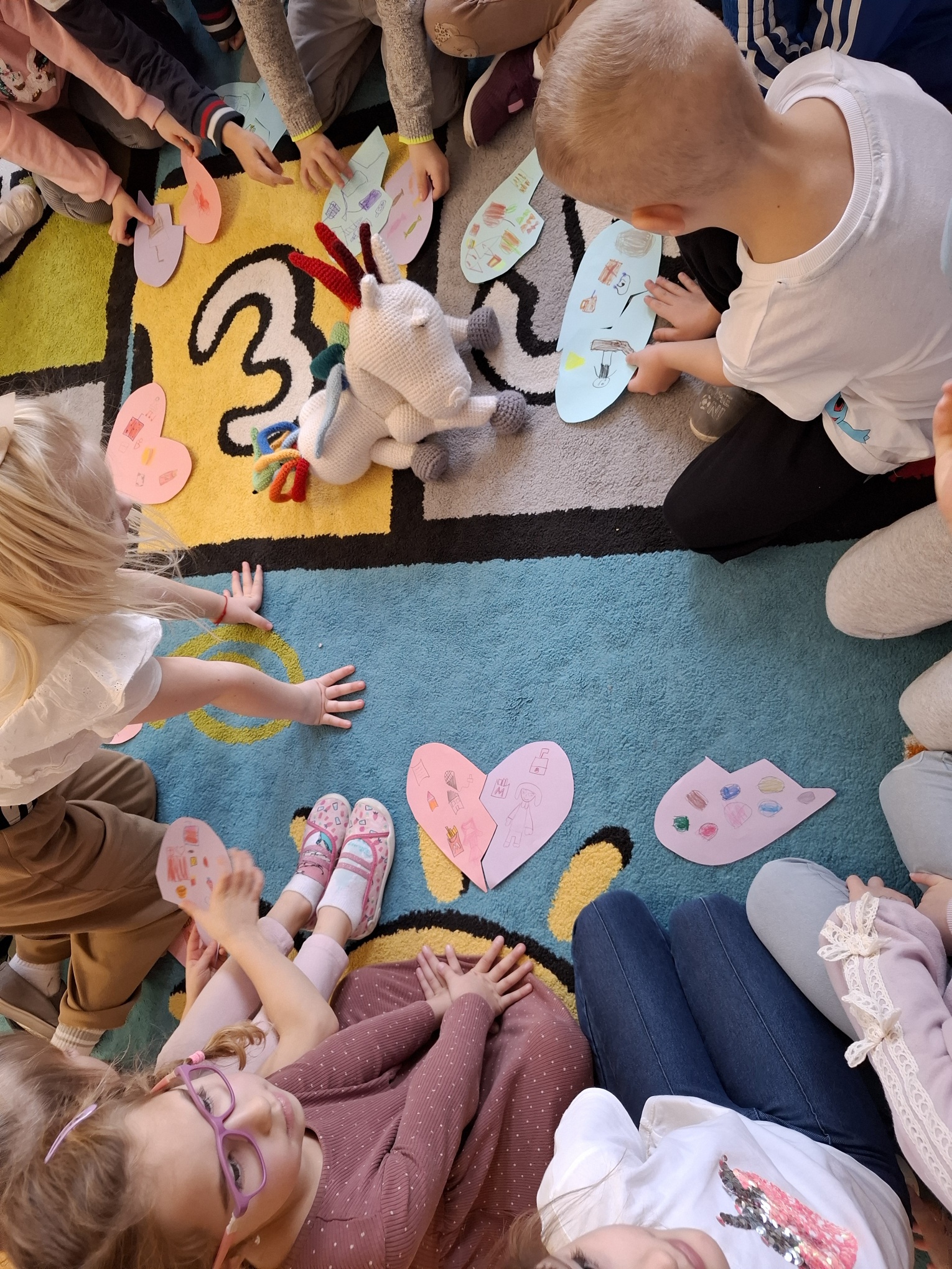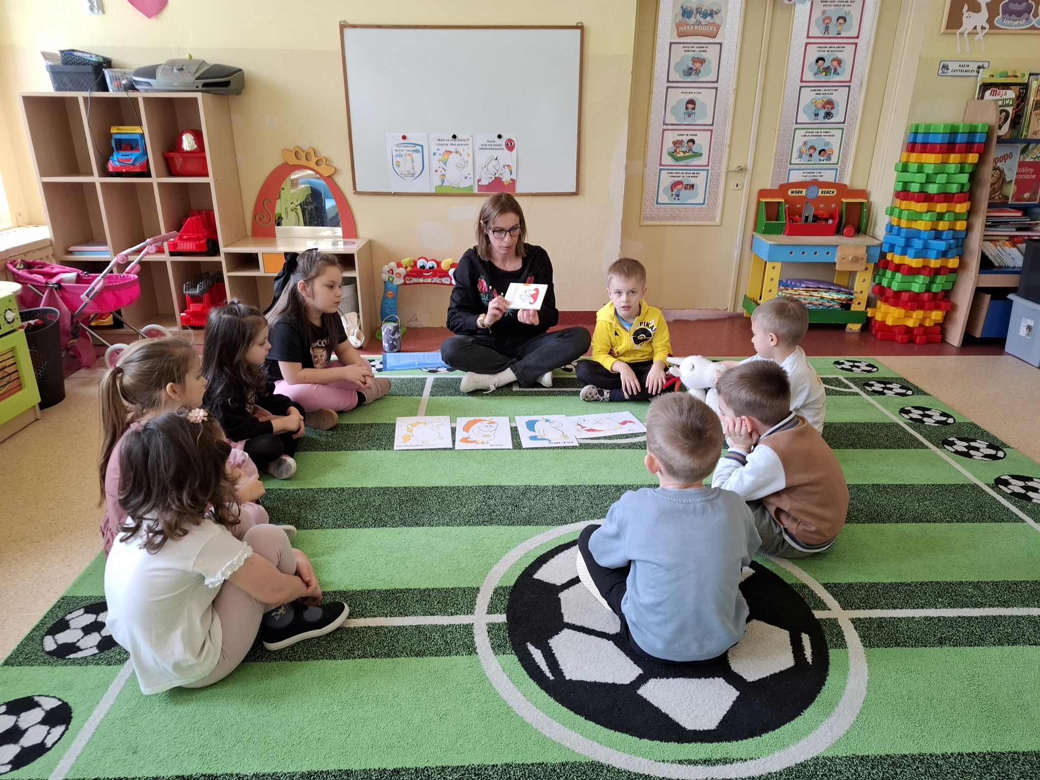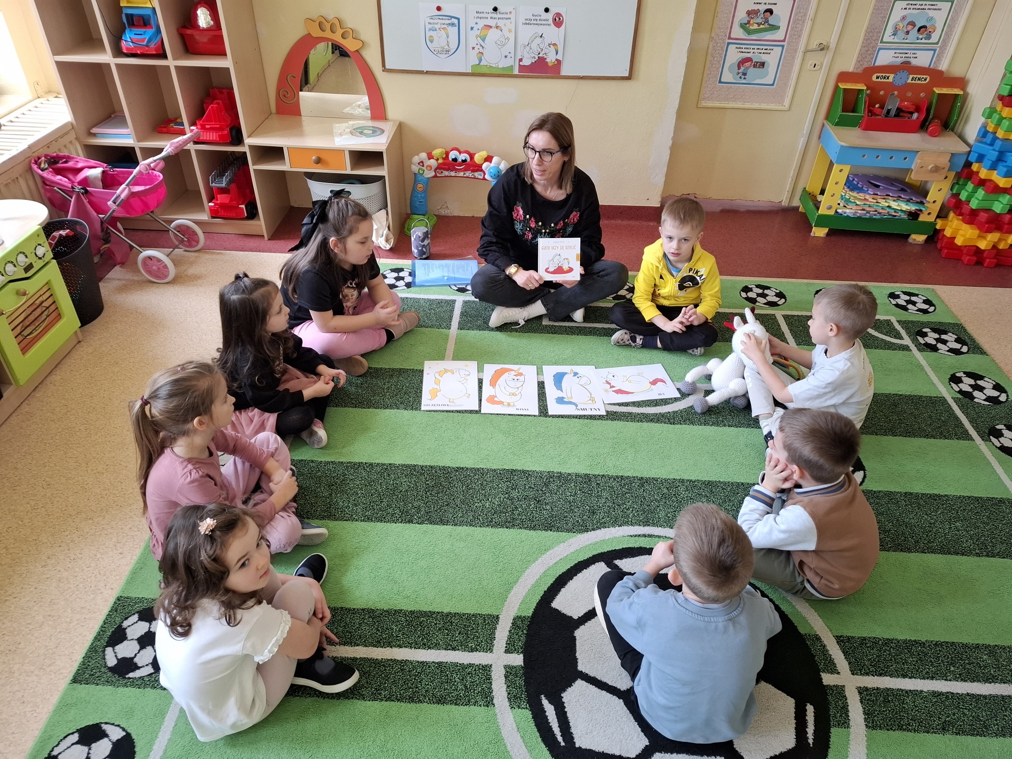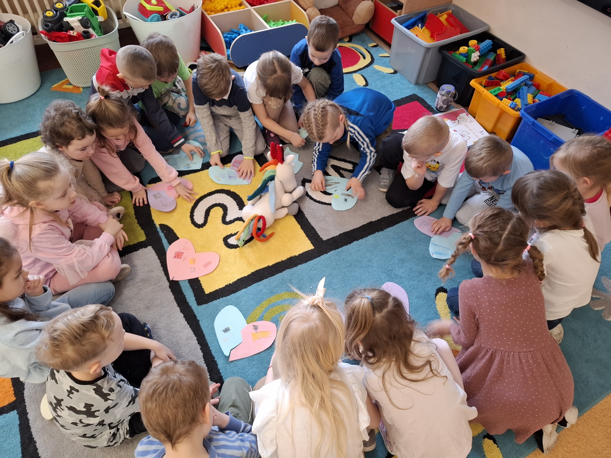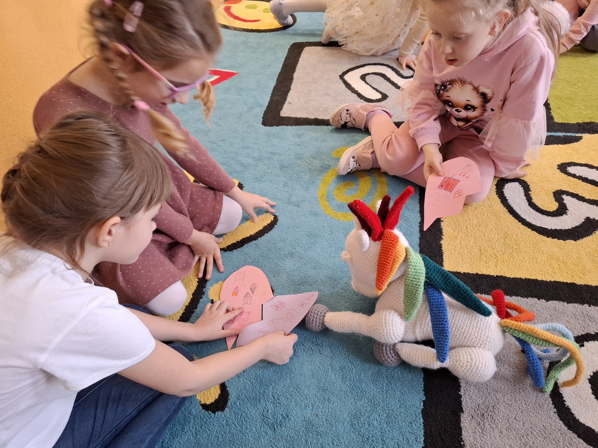 W ramach Międzynarodowego Projektu Edukacyjnego „Kolorowe Uczucia Gucia” odbyły się kolejne zajęcia z udziałem pani psycholog oraz niezwykłego gościa – jednorożca Gucia. Tematem spotkania były przygody małego jednorożca, oparte na książce „Gucio uczy się dzielić”, których celem było kształtowanie umiejętności dzielenia się oraz współpracy w grupie. Dzieci z zainteresowaniem wysłuchały opowiadania o Guciu, a następnie rozmawiały o emocjach bohatera oraz sytuacjach, w których trudno jest się dzielić. Uczyły się nazywać swoje uczucia i wspólnie szukały dobrych rozwiązań. Przedszkolaki wysłuchali piosenki o dzieleniu się zabawkami, przekąskami, umiejętnościami oraz wykonały prace plastyczne – czym chętnie podzielą się z innymi. Wspólna zabawa ruchowa i korzystanie z materiałów plastycznych było doskonałą okazją do ćwiczenia dzielenia się w praktyce. Zajęcia pomogły dzieciom zrozumieć, że dzielenie się może sprawiać radość i budować dobre relacje z innymi.