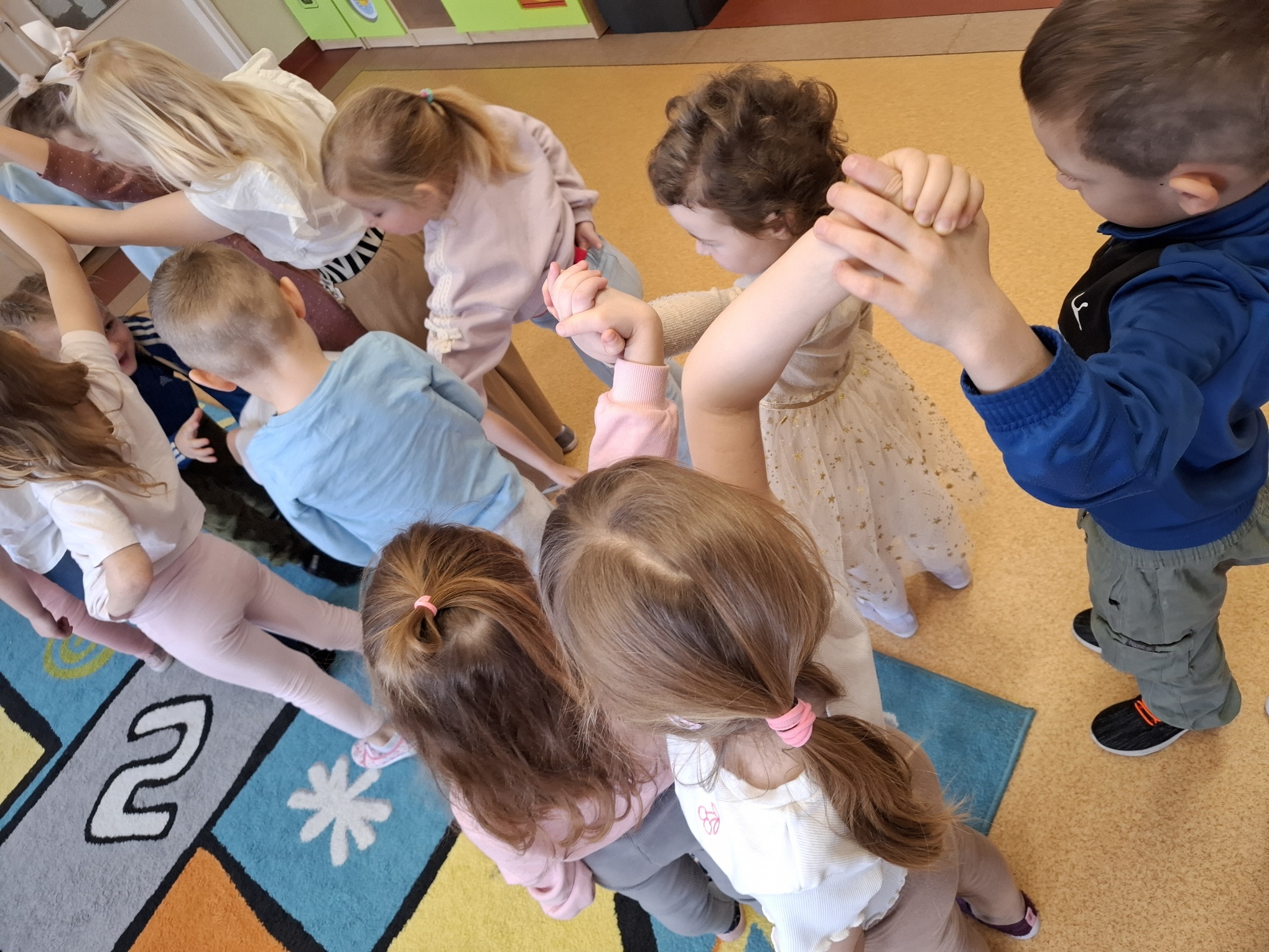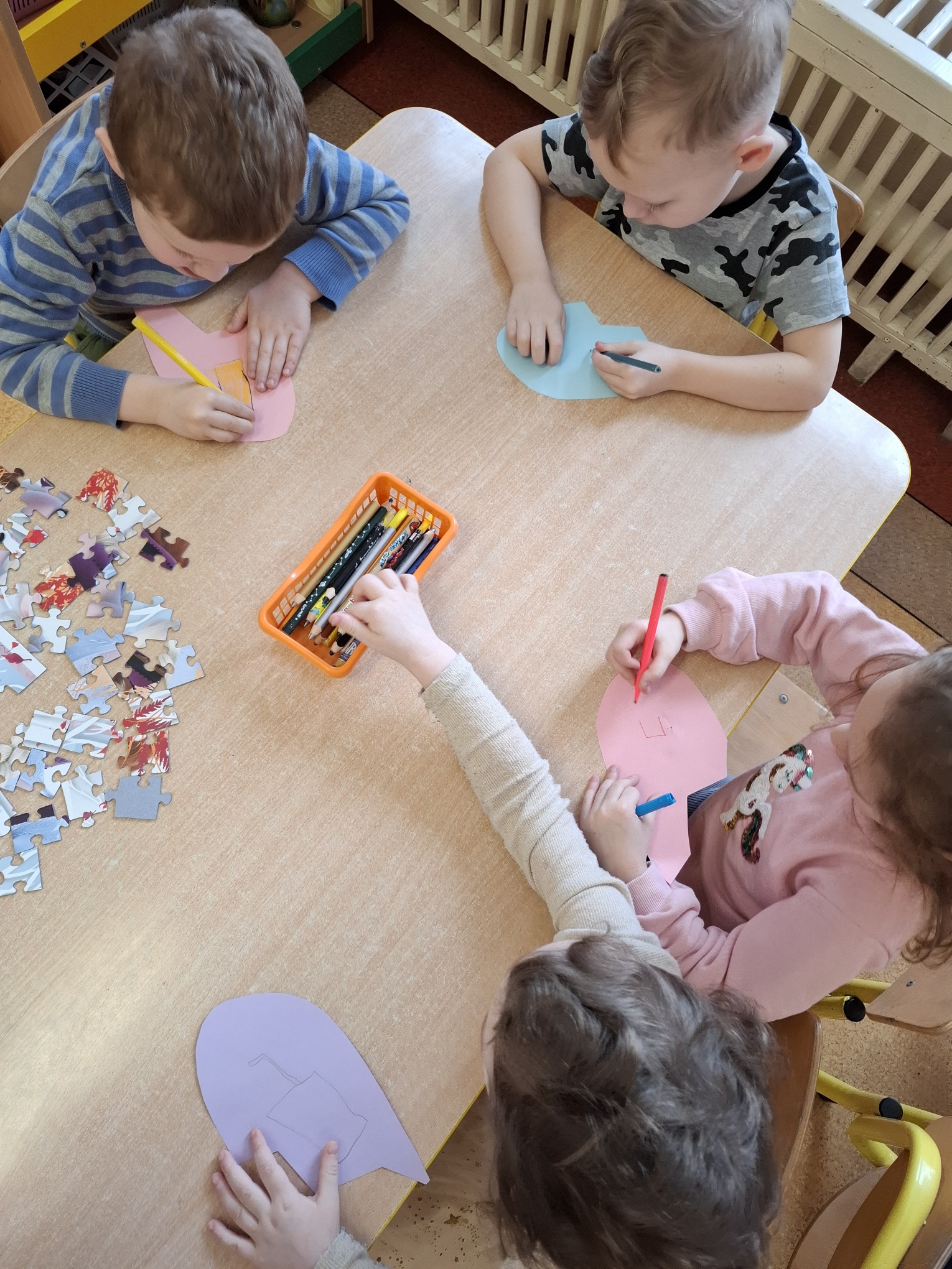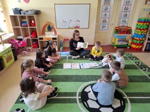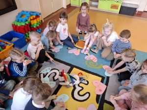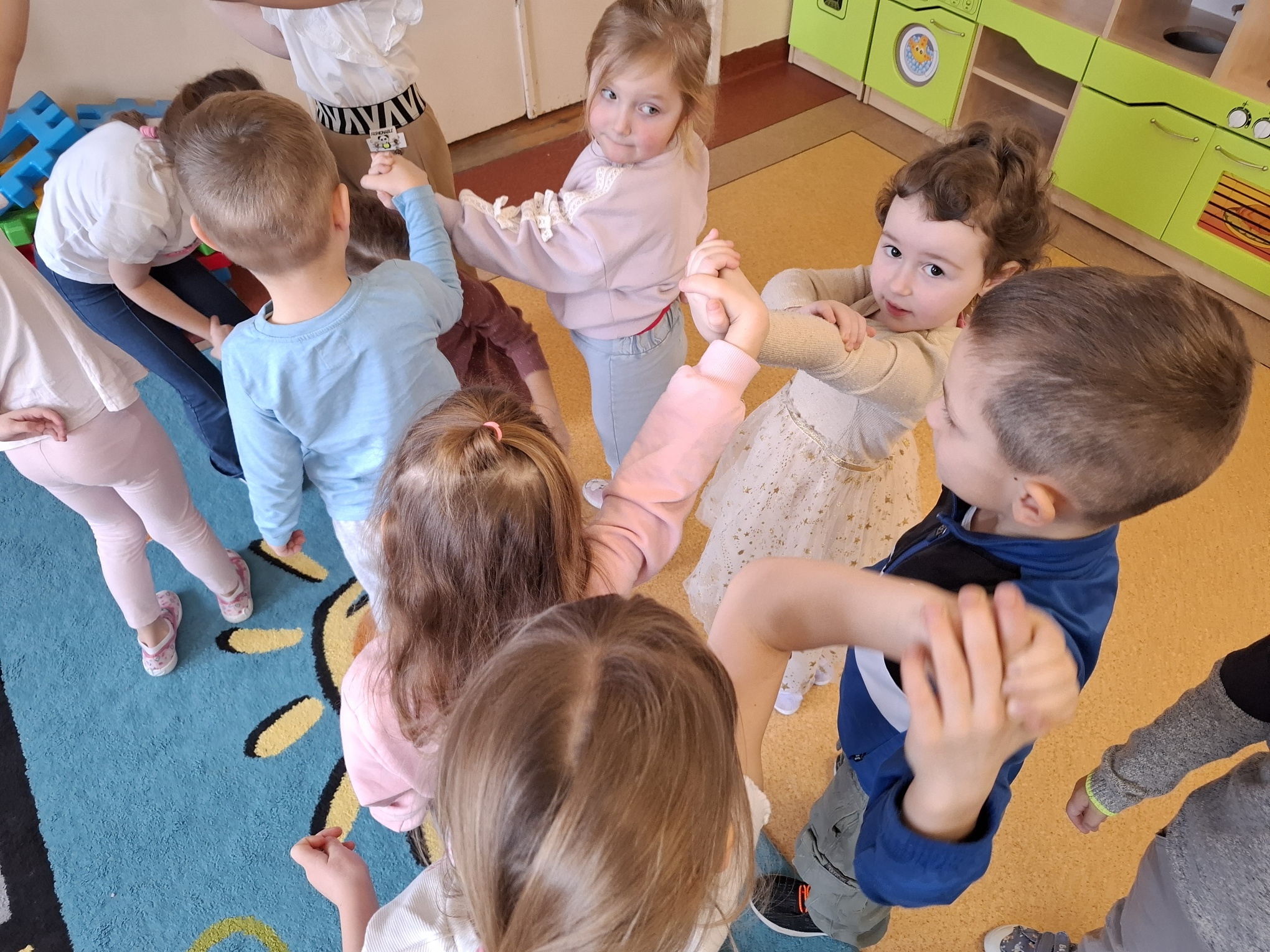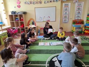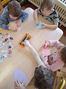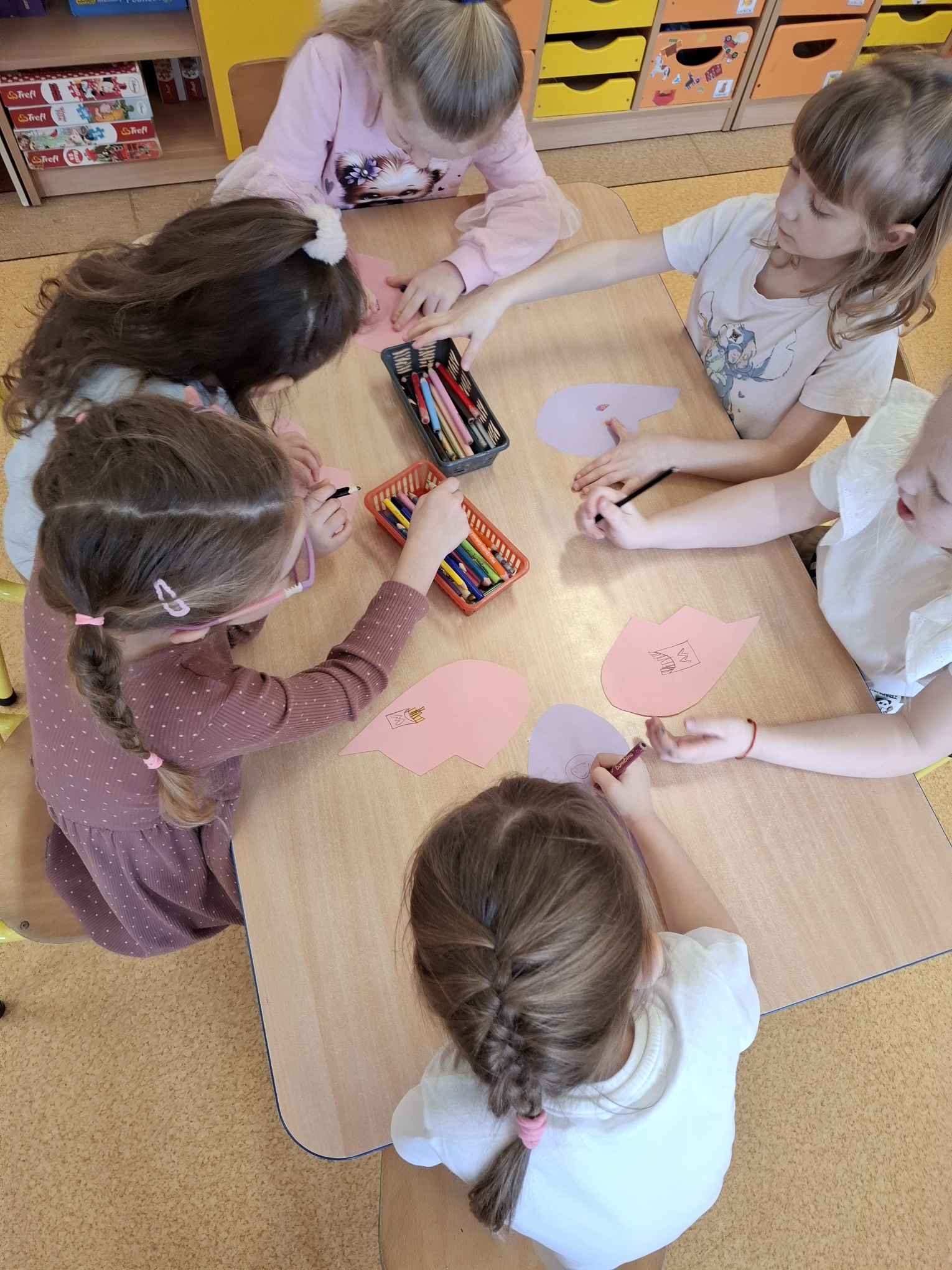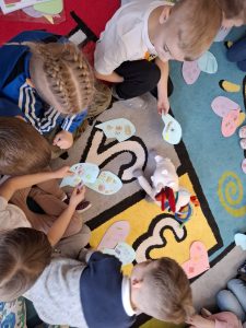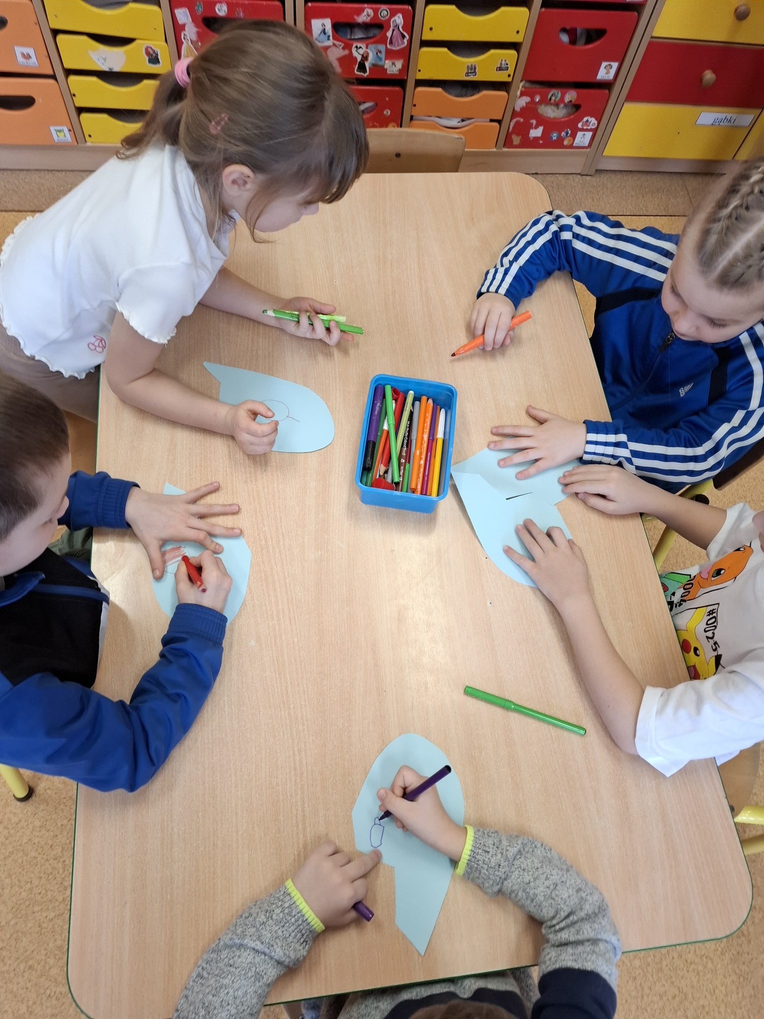 W ramach Międzynarodowego Projektu Edukacyjnego „Kolorowe Uczucia Gucia” odbyły się kolejne zajęcia z udziałem pani psycholog oraz niezwykłego gościa – jednorożca Gucia. Tematem spotkania były przygody małego jednorożca, oparte na książce „Gucio uczy się dzielić”, których celem było kształtowanie umiejętności dzielenia się oraz współpracy w grupie. Dzieci z zainteresowaniem wysłuchały opowiadania o Guciu, a następnie rozmawiały o emocjach bohatera oraz sytuacjach, w których trudno jest się dzielić. Uczyły się nazywać swoje uczucia i wspólnie szukały dobrych rozwiązań. Przedszkolaki wysłuchali piosenki o dzieleniu się zabawkami, przekąskami, umiejętnościami oraz wykonały prace plastyczne – czym chętnie podzielą się z innymi. Wspólna zabawa ruchowa i korzystanie z materiałów plastycznych było doskonałą okazją do ćwiczenia dzielenia się w praktyce. Zajęcia pomogły dzieciom zrozumieć, że dzielenie się może sprawiać radość i budować dobre relacje z innymi.