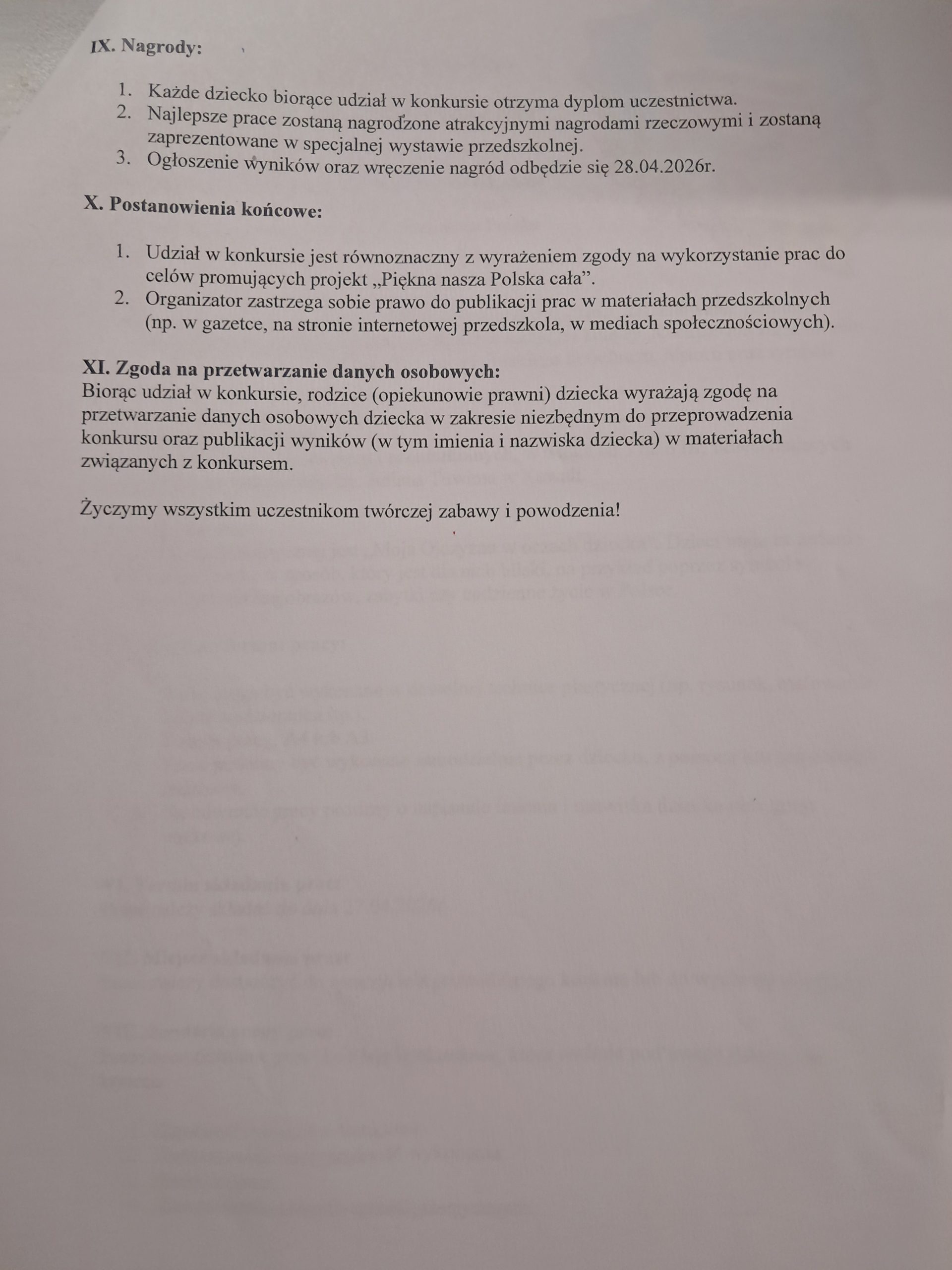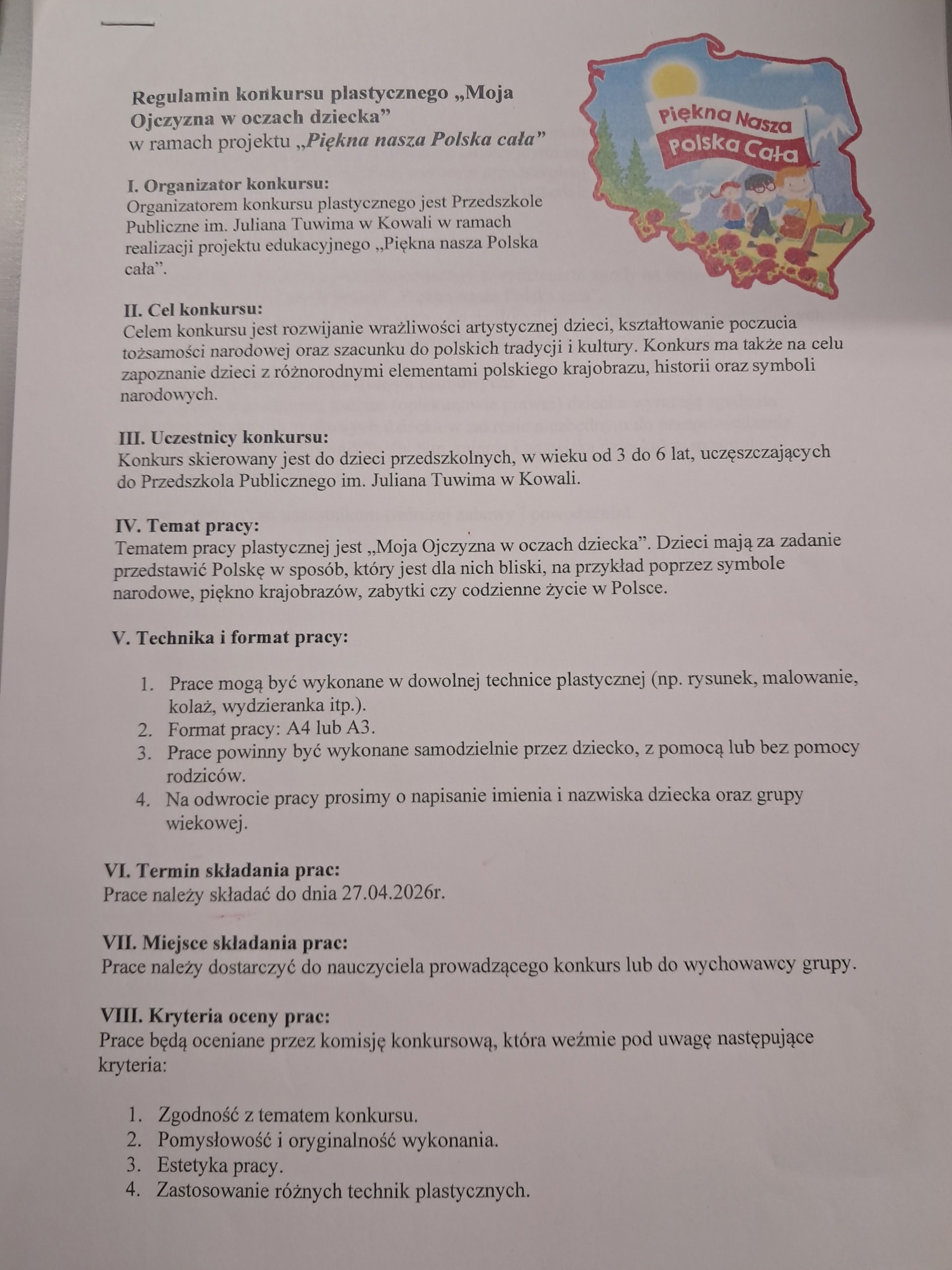Zapraszamy nasze przedszkolaki do udziału w konkursie plastycznym ,, Moja ojczyzna w oczach dziecka”. Zadaniem dzieci jest przedstawić naszą ojczyznę w sposób, który jest dla nich bliski, na przykład poprzez symbole narodowe, piękno krajobrazów, zabytki czy codzienne życie w Polsce. Zapraszamy do udziału! Regulamin ponizej.